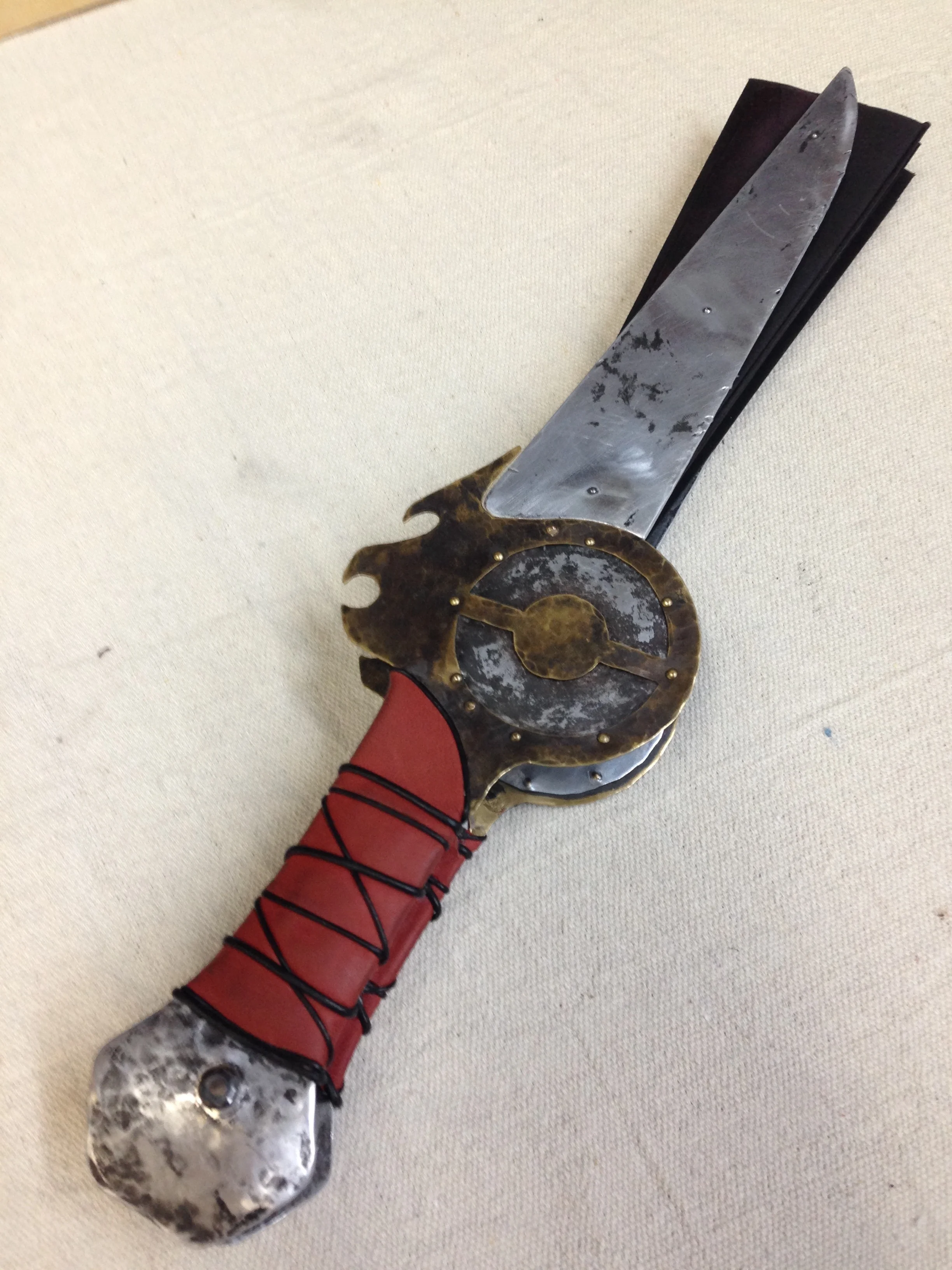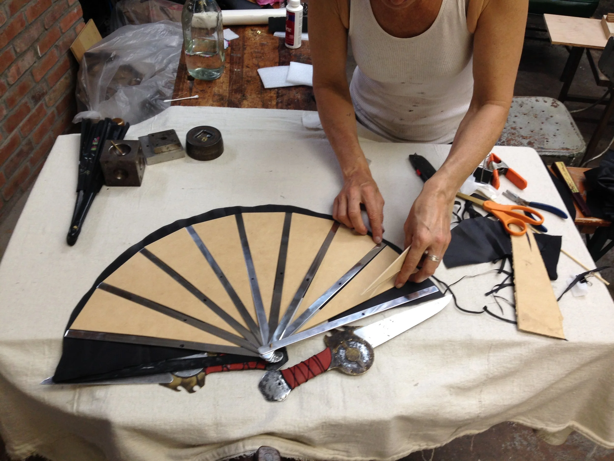 Dagger fan prototype - aluminum brass silk and leather created in collaboration with Rory Berthiaume